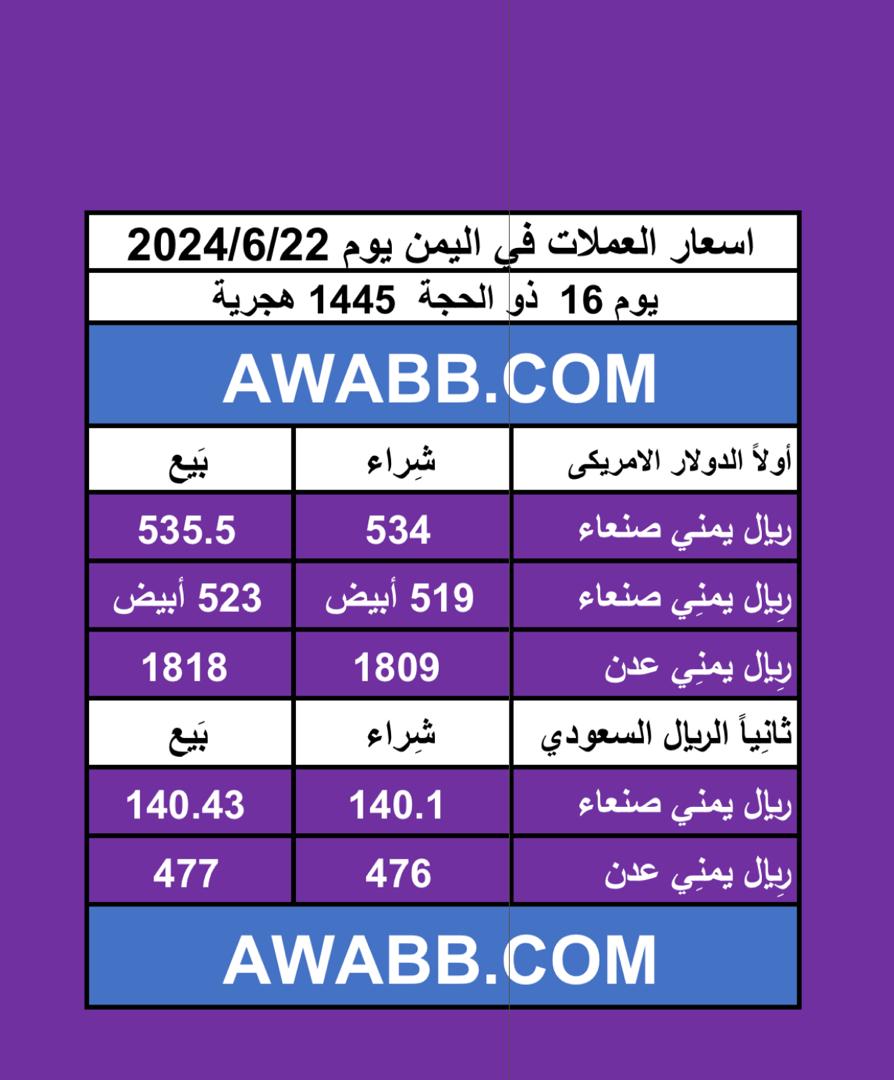 https://awabb.com/ad/%d8%a7%d8%b3%d8%b9%d8%a7%d8%b1-%d8%a7%d9%84%d8%b9%d9%85%d9%84%d8%a7%d8%aa-%d9%81%d9%8a-%d8%a7%d9%84%d9%8a%d9%85%d9%86-%d9%8a%d9%88%d9%85-2024-6-22/