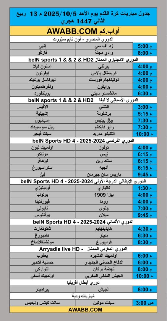 https://awabb.com/ad/%d8%ac%d8%af%d9%88%d9%84-%d9%85%d8%a8%d8%a7%d8%b1%d9%8a%d8%a7%d8%aa-%d9%83%d8%b1%d8%a9-%d8%a7%d9%84%d9%82%d8%af%d9%85-%d9%8a%d9%88%d9%85-%d8%a7%d9%84%d8%a3%d8%ad%d8%af-2025-10-5-%d9%85-13-%d8%b1%d8%a8/