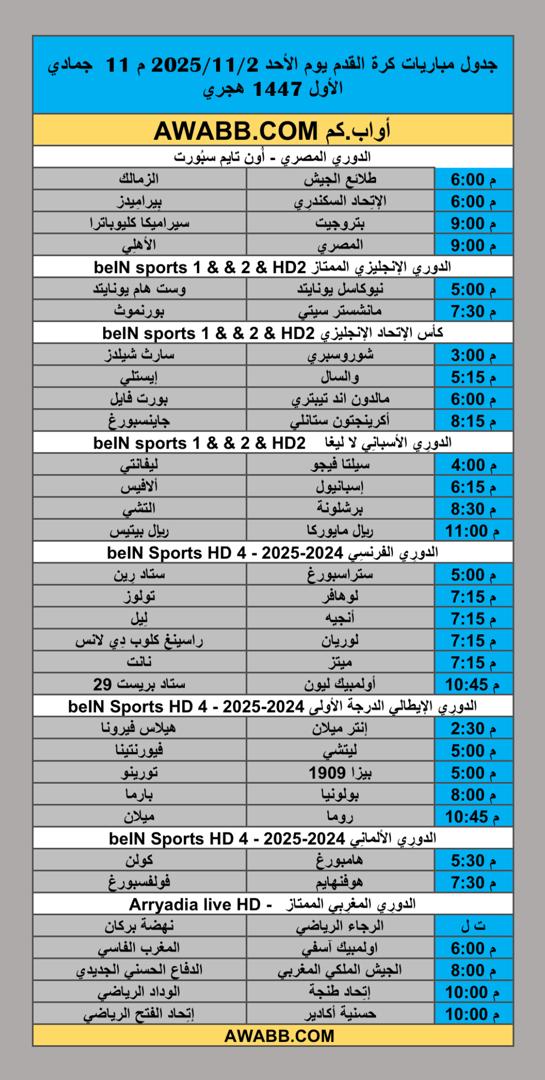 https://awabb.com/ad/%d8%ac%d8%af%d9%88%d9%84-%d9%85%d8%a8%d8%a7%d8%b1%d9%8a%d8%a7%d8%aa-%d9%83%d8%b1%d8%a9-%d8%a7%d9%84%d9%82%d8%af%d9%85-%d9%8a%d9%88%d9%85-%d8%a7%d9%84%d8%a3%d8%ad%d8%af-2025-11-2-%d9%85-11-%d8%ac%d9%85/