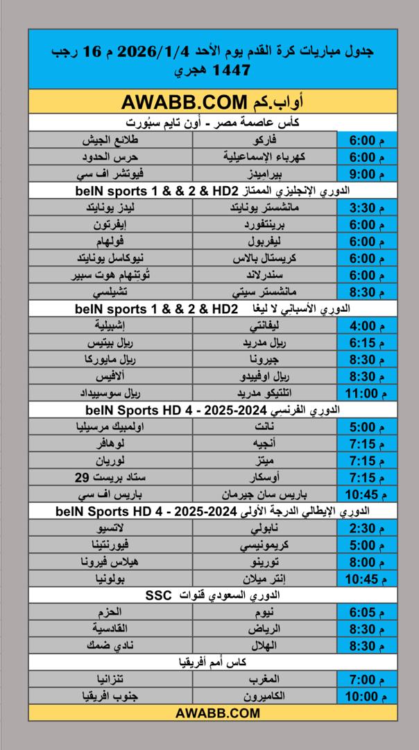 https://awabb.com/ad/%d8%ac%d8%af%d9%88%d9%84-%d9%85%d8%a8%d8%a7%d8%b1%d9%8a%d8%a7%d8%aa-%d9%83%d8%b1%d8%a9-%d8%a7%d9%84%d9%82%d8%af%d9%85-%d9%8a%d9%88%d9%85-%d8%a7%d9%84%d8%a3%d8%ad%d8%af-2026-1-4-%d9%85-16-%d8%b1%d8%ac/