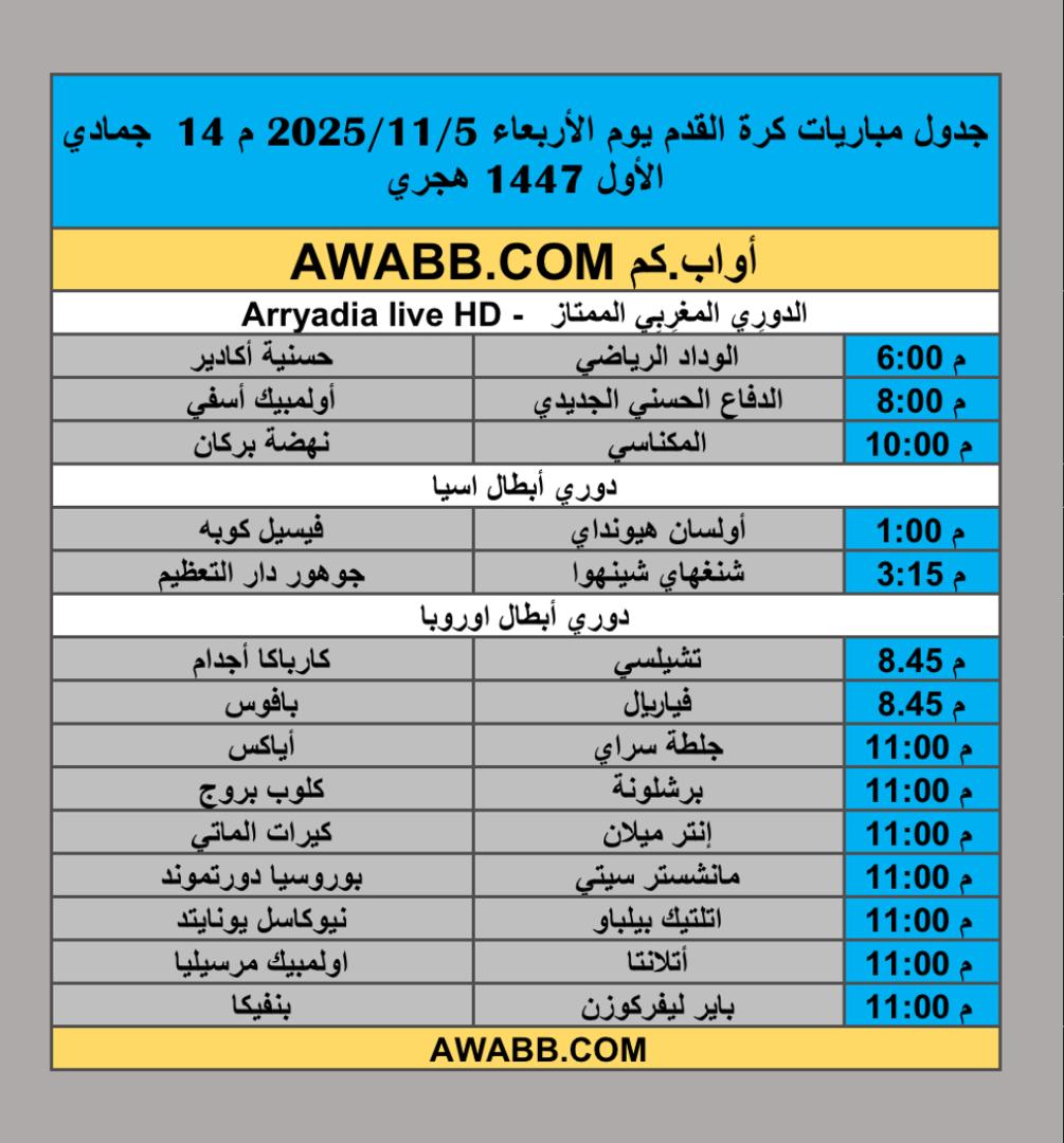 https://awabb.com/ad/%d8%ac%d8%af%d9%88%d9%84-%d9%85%d8%a8%d8%a7%d8%b1%d9%8a%d8%a7%d8%aa-%d9%83%d8%b1%d8%a9-%d8%a7%d9%84%d9%82%d8%af%d9%85-%d9%8a%d9%88%d9%85-%d8%a7%d9%84%d8%a3%d8%b1%d8%a8%d8%b9%d8%a7%d8%a1-2025-11-5/