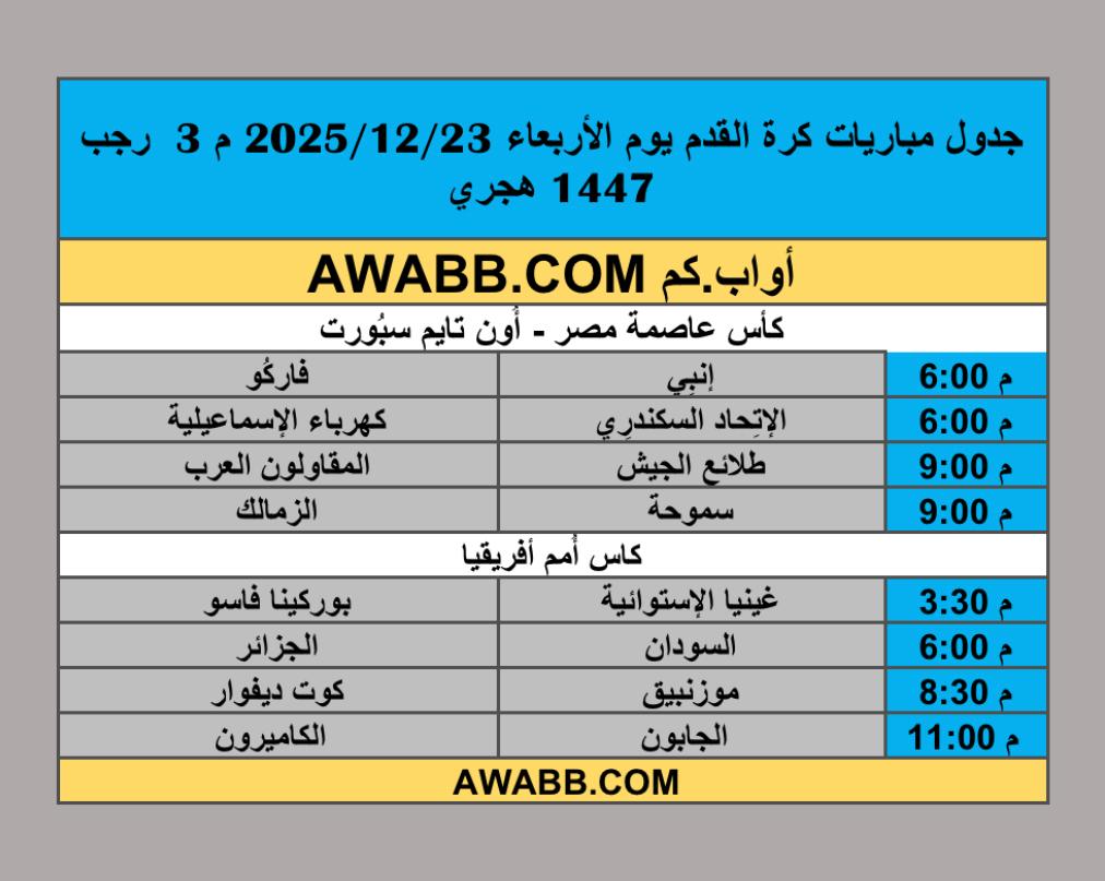 https://awabb.com/ad/%d8%ac%d8%af%d9%88%d9%84-%d9%85%d8%a8%d8%a7%d8%b1%d9%8a%d8%a7%d8%aa-%d9%83%d8%b1%d8%a9-%d8%a7%d9%84%d9%82%d8%af%d9%85-%d9%8a%d9%88%d9%85-%d8%a7%d9%84%d8%a3%d8%b1%d8%a8%d8%b9%d8%a7%d8%a1-2025-12-23/