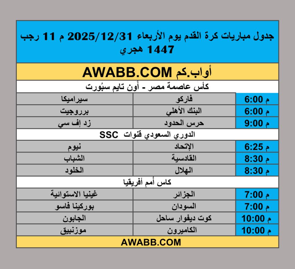 https://awabb.com/ad/%d8%ac%d8%af%d9%88%d9%84-%d9%85%d8%a8%d8%a7%d8%b1%d9%8a%d8%a7%d8%aa-%d9%83%d8%b1%d8%a9-%d8%a7%d9%84%d9%82%d8%af%d9%85-%d9%8a%d9%88%d9%85-%d8%a7%d9%84%d8%a3%d8%b1%d8%a8%d8%b9%d8%a7%d8%a1-2025-12-31/