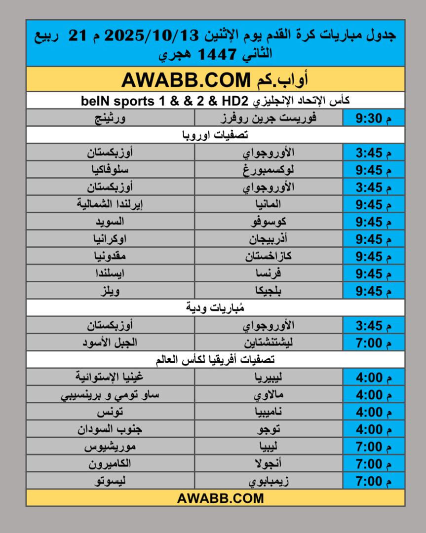 https://awabb.com/ad/%d8%ac%d8%af%d9%88%d9%84-%d9%85%d8%a8%d8%a7%d8%b1%d9%8a%d8%a7%d8%aa-%d9%83%d8%b1%d8%a9-%d8%a7%d9%84%d9%82%d8%af%d9%85-%d9%8a%d9%88%d9%85-%d8%a7%d9%84%d8%a5%d8%ab%d9%86%d9%8a%d9%86-2025-10-13-%d9%85-21/