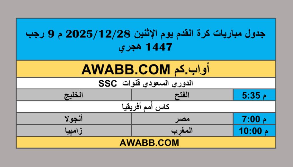 https://awabb.com/ad/%d8%ac%d8%af%d9%88%d9%84-%d9%85%d8%a8%d8%a7%d8%b1%d9%8a%d8%a7%d8%aa-%d9%83%d8%b1%d8%a9-%d8%a7%d9%84%d9%82%d8%af%d9%85-%d9%8a%d9%88%d9%85-%d8%a7%d9%84%d8%a5%d8%ab%d9%86%d9%8a%d9%86-2025-12-28-%d9%85-9/
