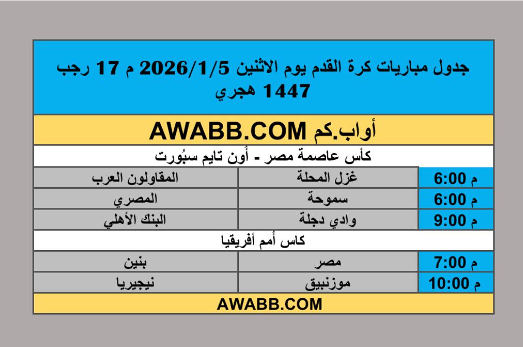 https://awabb.com/ad/%d8%ac%d8%af%d9%88%d9%84-%d9%85%d8%a8%d8%a7%d8%b1%d9%8a%d8%a7%d8%aa-%d9%83%d8%b1%d8%a9-%d8%a7%d9%84%d9%82%d8%af%d9%85-%d9%8a%d9%88%d9%85-%d8%a7%d9%84%d8%a7%d8%ab%d9%86%d9%8a%d9%86-2026-1-5-%d9%85-17/