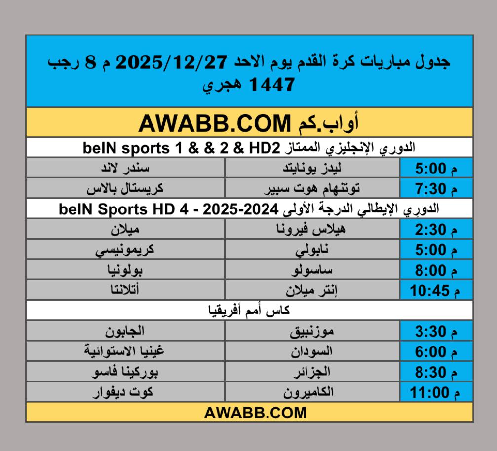 https://awabb.com/ad/%d8%ac%d8%af%d9%88%d9%84-%d9%85%d8%a8%d8%a7%d8%b1%d9%8a%d8%a7%d8%aa-%d9%83%d8%b1%d8%a9-%d8%a7%d9%84%d9%82%d8%af%d9%85-%d9%8a%d9%88%d9%85-%d8%a7%d9%84%d8%a7%d8%ad%d8%af-2025-12-27-%d9%85-8-%d8%b1%d8%ac/