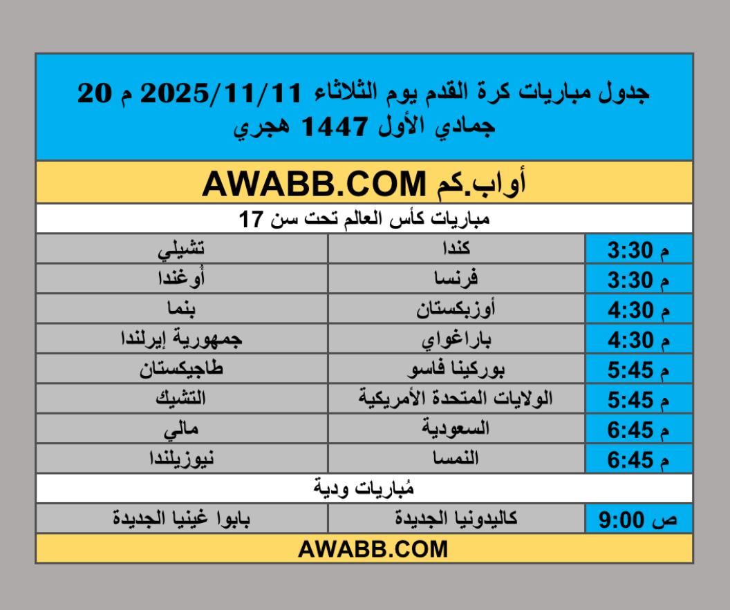 https://awabb.com/ad/%d8%ac%d8%af%d9%88%d9%84-%d9%85%d8%a8%d8%a7%d8%b1%d9%8a%d8%a7%d8%aa-%d9%83%d8%b1%d8%a9-%d8%a7%d9%84%d9%82%d8%af%d9%85-%d9%8a%d9%88%d9%85-%d8%a7%d9%84%d8%ab%d9%84%d8%a7%d8%ab%d8%a7%d8%a1-2025-11-11/