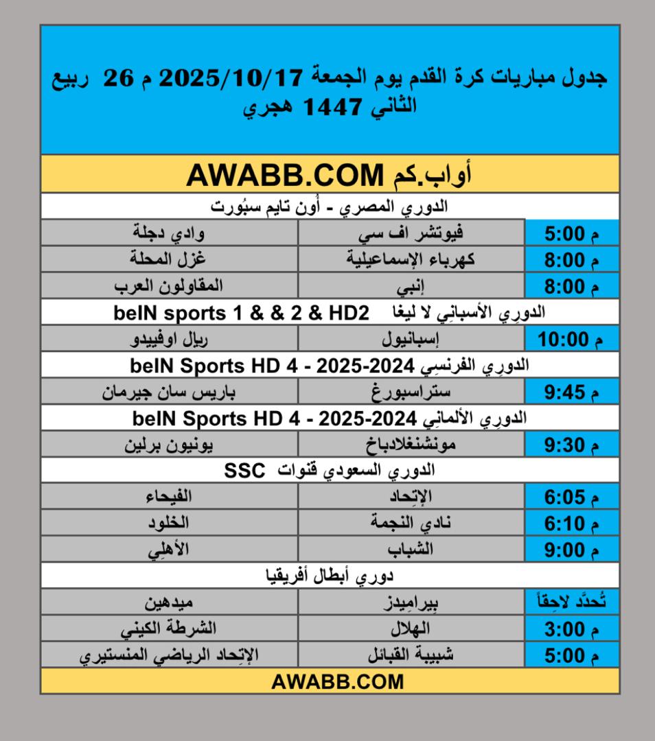 https://awabb.com/ad/%d8%ac%d8%af%d9%88%d9%84-%d9%85%d8%a8%d8%a7%d8%b1%d9%8a%d8%a7%d8%aa-%d9%83%d8%b1%d8%a9-%d8%a7%d9%84%d9%82%d8%af%d9%85-%d9%8a%d9%88%d9%85-%d8%a7%d9%84%d8%ac%d9%85%d8%b9%d8%a9-2025-10-17-%d9%85-26/