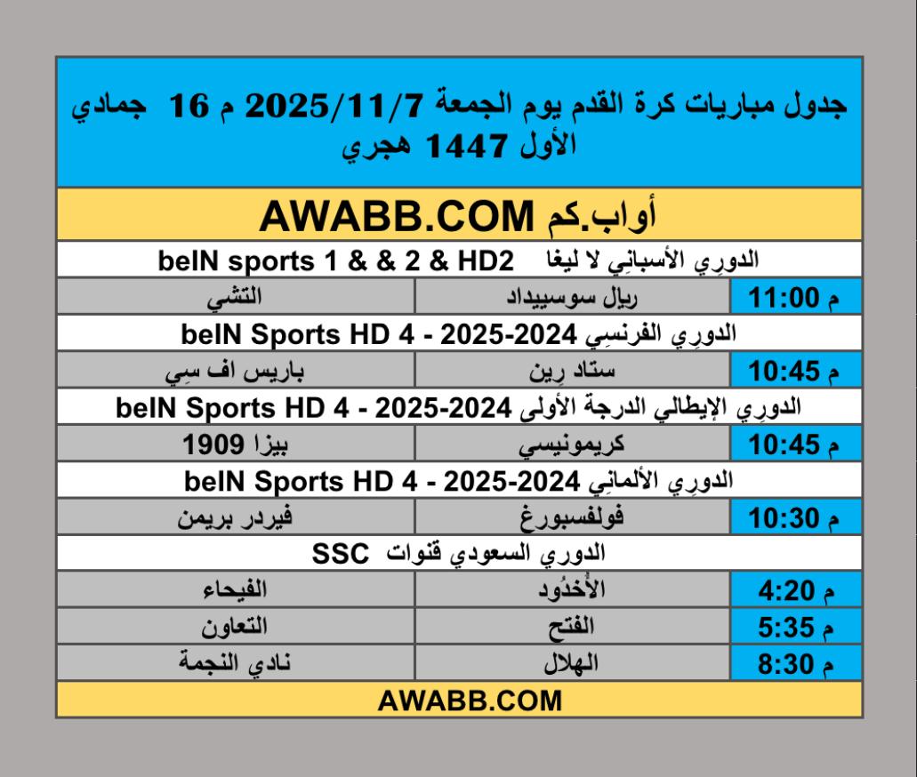 https://awabb.com/ad/%d8%ac%d8%af%d9%88%d9%84-%d9%85%d8%a8%d8%a7%d8%b1%d9%8a%d8%a7%d8%aa-%d9%83%d8%b1%d8%a9-%d8%a7%d9%84%d9%82%d8%af%d9%85-%d9%8a%d9%88%d9%85-%d8%a7%d9%84%d8%ac%d9%85%d8%b9%d8%a9-2025-11-7-%d9%85-16-%d8%ac/