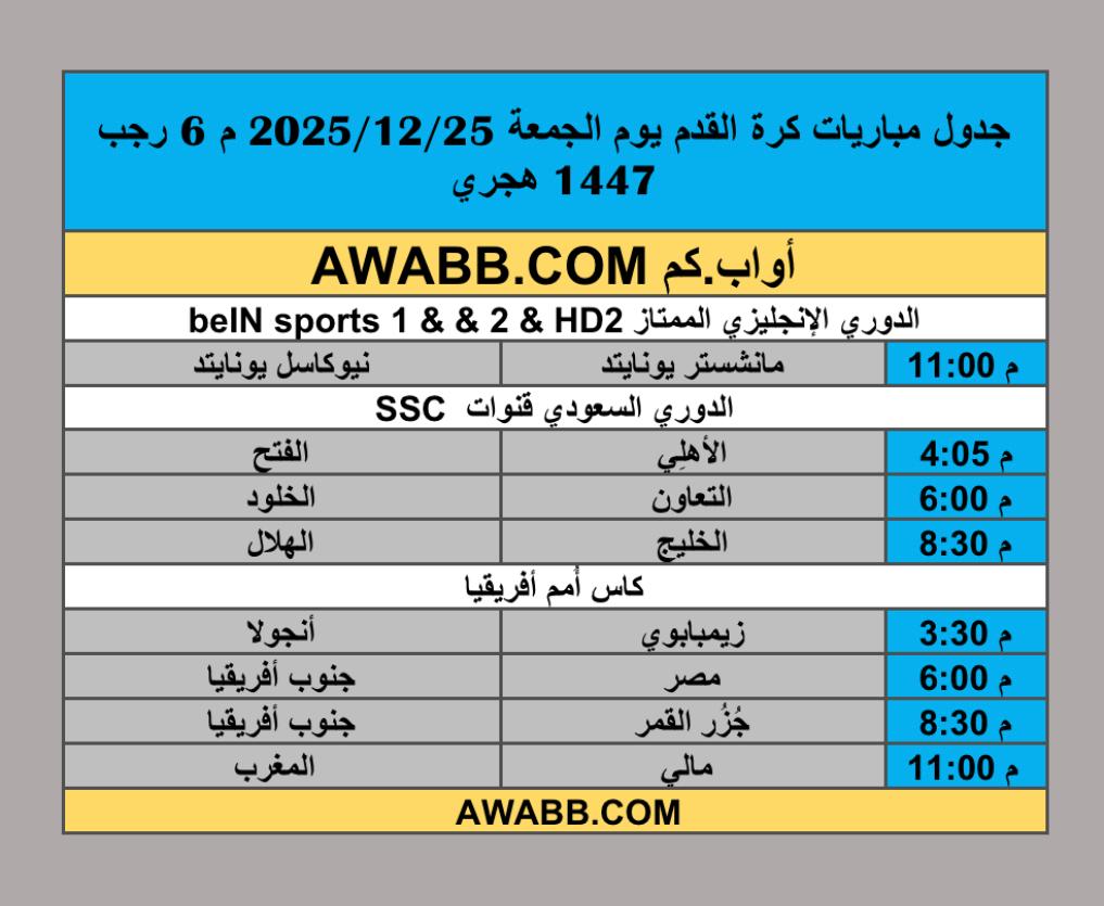 https://awabb.com/ad/%d8%ac%d8%af%d9%88%d9%84-%d9%85%d8%a8%d8%a7%d8%b1%d9%8a%d8%a7%d8%aa-%d9%83%d8%b1%d8%a9-%d8%a7%d9%84%d9%82%d8%af%d9%85-%d9%8a%d9%88%d9%85-%d8%a7%d9%84%d8%ac%d9%85%d8%b9%d8%a9-2025-12-25-%d9%85-6-%d8%b1/