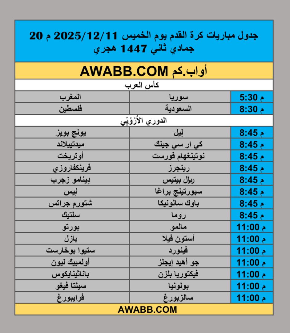 https://awabb.com/ad/%d8%ac%d8%af%d9%88%d9%84-%d9%85%d8%a8%d8%a7%d8%b1%d9%8a%d8%a7%d8%aa-%d9%83%d8%b1%d8%a9-%d8%a7%d9%84%d9%82%d8%af%d9%85-%d9%8a%d9%88%d9%85-%d8%a7%d9%84%d8%ae%d9%85%d9%8a%d8%b3-2025-12-11-%d9%85-20/
