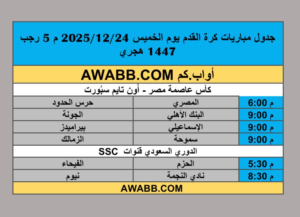 https://awabb.com/ad/%d8%ac%d8%af%d9%88%d9%84-%d9%85%d8%a8%d8%a7%d8%b1%d9%8a%d8%a7%d8%aa-%d9%83%d8%b1%d8%a9-%d8%a7%d9%84%d9%82%d8%af%d9%85-%d9%8a%d9%88%d9%85-%d8%a7%d9%84%d8%ae%d9%85%d9%8a%d8%b3-2025-12-24-%d9%85-5-%d8%b1/