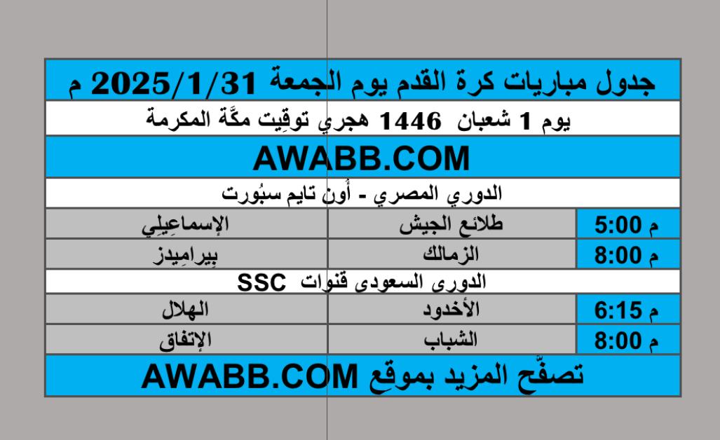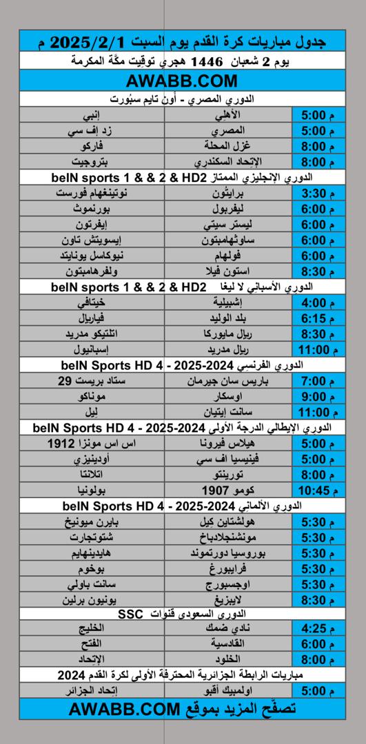 https://awabb.com/ad/%d8%ac%d8%af%d9%88%d9%84-%d9%85%d8%a8%d8%a7%d8%b1%d9%8a%d8%a7%d8%aa-%d9%83%d8%b1%d8%a9-%d8%a7%d9%84%d9%82%d8%af%d9%85-%d9%8a%d9%88%d9%85-%d8%a7%d9%84%d8%b3%d8%a8%d8%aa-2025-2-1-%d9%85/