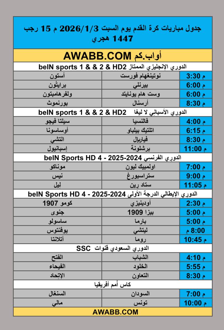 https://awabb.com/ad/%d8%ac%d8%af%d9%88%d9%84-%d9%85%d8%a8%d8%a7%d8%b1%d9%8a%d8%a7%d8%aa-%d9%83%d8%b1%d8%a9-%d8%a7%d9%84%d9%82%d8%af%d9%85-%d9%8a%d9%88%d9%85-%d8%a7%d9%84%d8%b3%d8%a8%d8%aa-2026-1-3-%d9%85-15-%d8%b1%d8%ac/