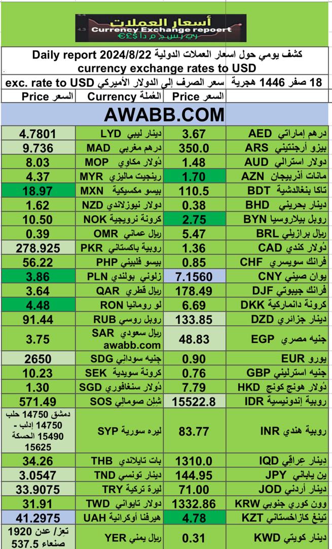 https://awabb.com/ad/%d9%83%d8%b4%d9%81-%d9%8a%d9%88%d9%85%d9%8a-%d8%ad%d9%88%d9%84-%d8%a7%d8%b3%d8%b9%d8%a7%d8%b1-%d8%a7%d9%84%d8%b9%d9%85%d9%84%d8%a7%d8%aa-%d8%a7%d9%84%d8%af%d9%88%d9%84%d9%8a%d8%a9-2024-8-22-daily-repo/